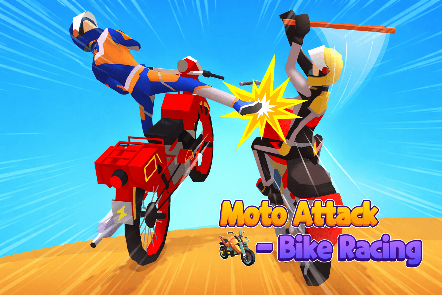Moto Attack Bike Racing delivers vibrant, high-energy 3D action. Sleek bikes gleam as they tear through sunlit corridors, traffic blurs past in chaotic streams, and rivals ragdoll dramatically when booted from their seats. Crashes explode with sparks and debris, while smooth animations ensure every lean and kick feels impactful.